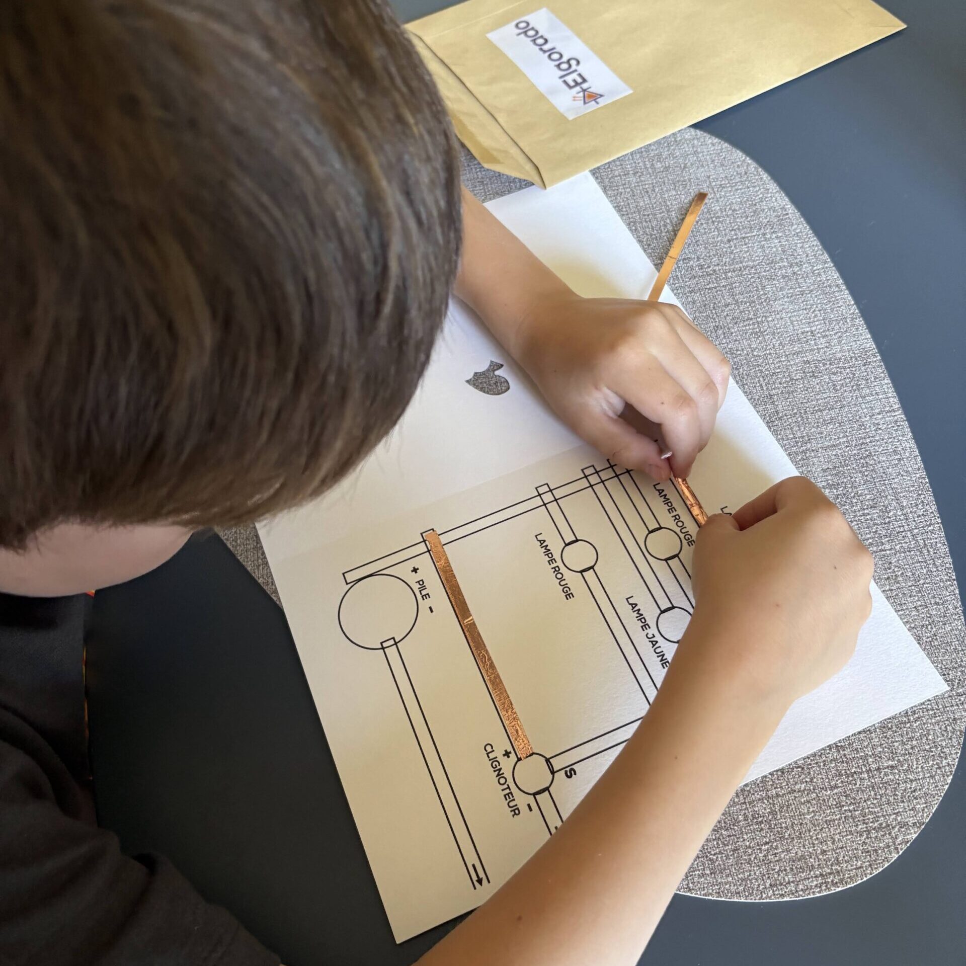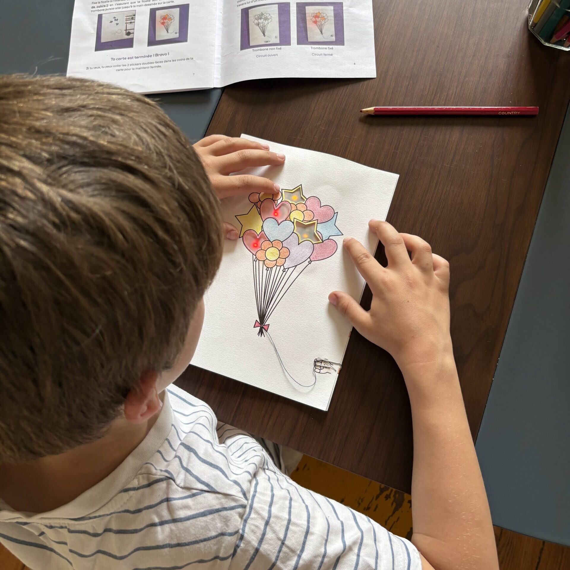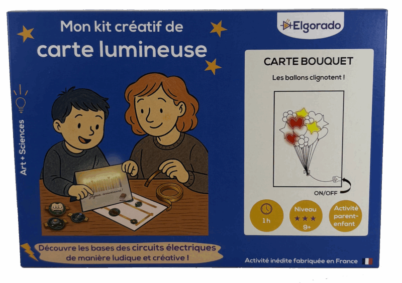 Ce kit Elgorado contient tout le nécessaire (papeterie, composants électroniques, notice) permettant de réaliser la carte lumineuse clignotante bouquet. C’est une activité parent-enfant idéale pour découvrir les bases des circuits électriques de manière ludique et créative à partir de 9 ans.