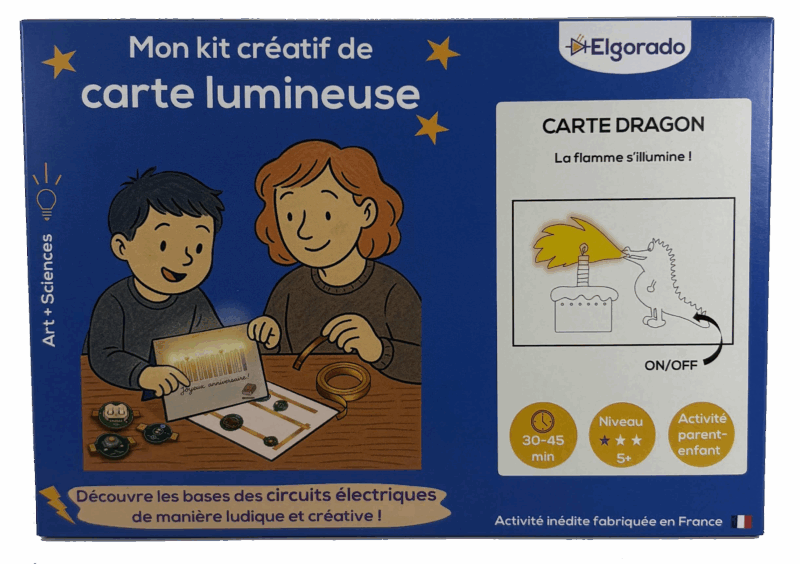 Ce kit Elgorado contient tout le nécessaire (papeterie, composants électroniques, notice) permettant de réaliser la carte lumineuse dragon. C’est une activité parent-enfant idéale pour découvrir les bases des circuits électriques de manière ludique et créative à partir de 5 ans.