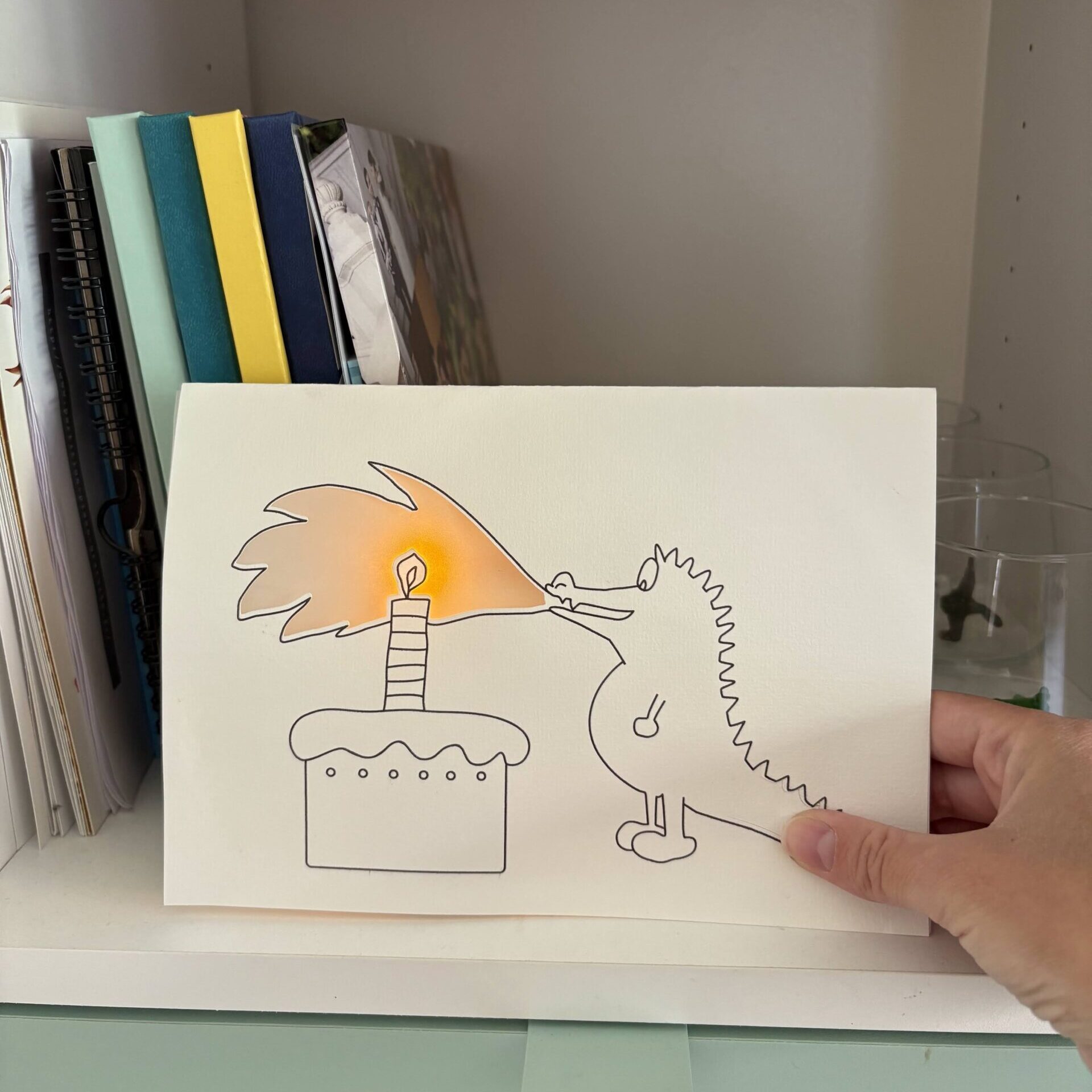 Aucune découpe n’est nécessaire pour réaliser cette carte. Vous aurez simplement besoin de matériel pour la colorier et d’un tube de colle !